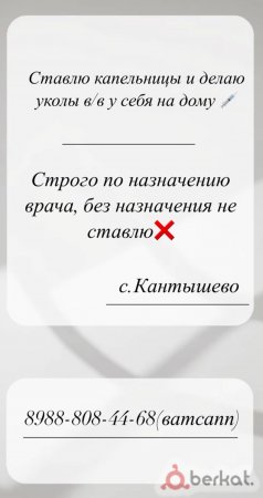 Ставлю капельницы, делаю уколы в/в и в/м у себя на дому. Нахожусь в Кантышево. Строго по назначению врача. Ватсапп 8988-808-44-68. Опыт работы 10 лет