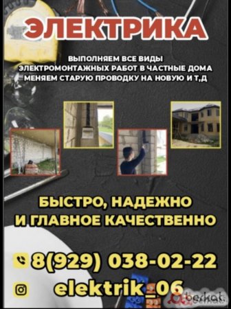 Ассаламу Алейкум Качественно выполняем все виды электрических работ устроняем замыкание прокладываем свет устанавливаем щитки, розетки, вещаем люстры меняем старую проводку и, тд