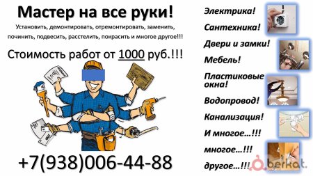 У вас накопилось много поломок или недоделок в доме? Вам нужно поменять смеситель или розетку, подвесить люстру или прочисть отстойник на кухне, сделать мелкий ремонт мебели или собрать ее, отрегулировать или починить окна, или что-то еще в таком роде? Тогда вам к нам! Предлагаю услуги мастера на все руки (он же мастер на час). Быстро, Качественно, Надежно!!! 24/7