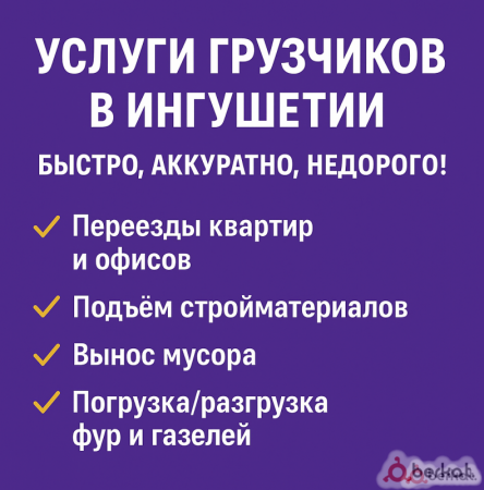 Услуги Грузчиков в Ингушетии Быстро, аккуратно, недорого! ✅ Переезды квартир и офисов ✅ Подъём стройматериалов ✅ Вынос мусора ✅ Погрузка/разгрузка фур и газелей Надёжные и опытные грузчики Есть газель при необходимости Работаем ежедневно, без выходных Звоните/пишите прямо сейчас: +7 (921) 109-56-45