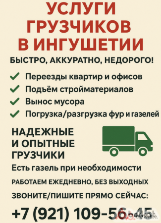 Услуги Грузчиков в Ингушетии Быстро, аккуратно, недорого! ✅ Переезды квартир и офисов ✅ Подъём стройматериалов ✅ Вынос мусора ✅ Погрузка/разгрузка фур и газелей Надёжные и опытные грузчики Есть газель при необходимости Работаем ежедневно, без выходных Звоните/пишите прямо сейчас: +7 (921) 109-56-45