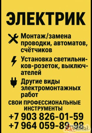 Электрик — любые сложности! ⚡ ✅ Свои профессиональные инструменты ✅ Гарантия на выполненные работы ✅ Честные цены, без накруток ✅ Ответственный и аккуратный подход Что делаю: ✅ Замена и ремонт проводки (квартиры, дома, офисы) ✅ Установка розеток, выключателей, светильников ✅ Быстро найду и устраню любые неполадки (нет света, выбивает автомат, греется проводка) ✅ Сборка и подключение электрощитов «под ключ