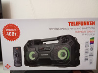 Новая магнитола от немецкой фирмы Телефункен...Флешка,блютуз,радио,аукс.Мощность 20+20=40ватт,чистейшего звука.Работает как от сети,так и от собственного встроенного аккумулятора.Заряд держит хорошо.Практически не использован...Вещь хорошая.