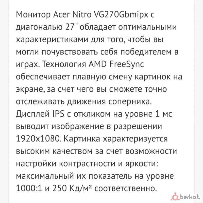 игровой монитор Асер 27 дюймов 100 гц, картинка четкая цветопередача хорошая, пользовались не долго, покупался за 12 , кто сегодня заберёт будет 9000