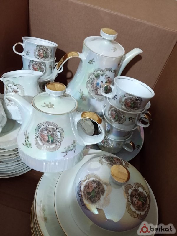 Стояла как для декора в стенке, очень красивый набор сервиза, набор не весь, 8 чашек,10 шт тарелок под чашки, 11 закусочных, 2 большие, 2 соусницы, 2 сахарницы, и 2 чайника один из чайников музыкальный с заводным механизмом, продаю потому что негде уже хранить