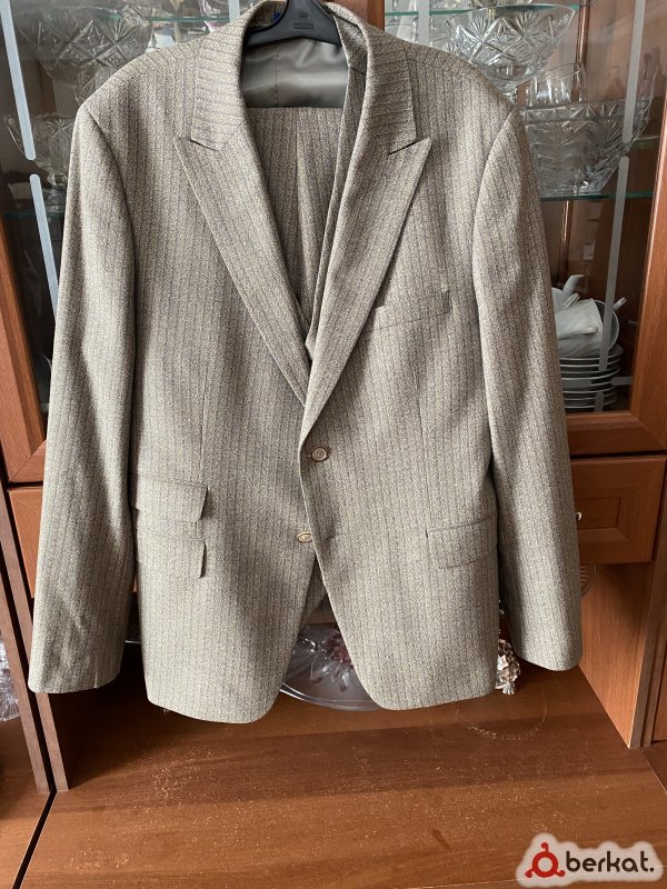 Продаю костюм классический тройка, практически в новом состоянии, одевал 2 раза, причина продажи стал маловат. Цвет бежевый с синими полосками, в живую очень красивый, размер 52.