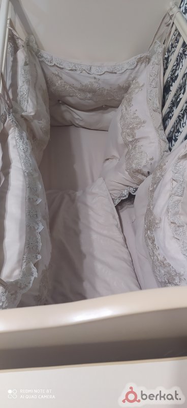 Производство Турция. Постельное как на последней фотке(отдельно покупалось в районе 10т.). В магазине такой комплект кроватки стоит в пределах 30т., а то и больше. Кроватка в разобранном виде. Все имеется в сборе, в том числе и матрас. Отдам все за 10т.