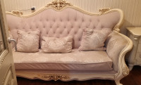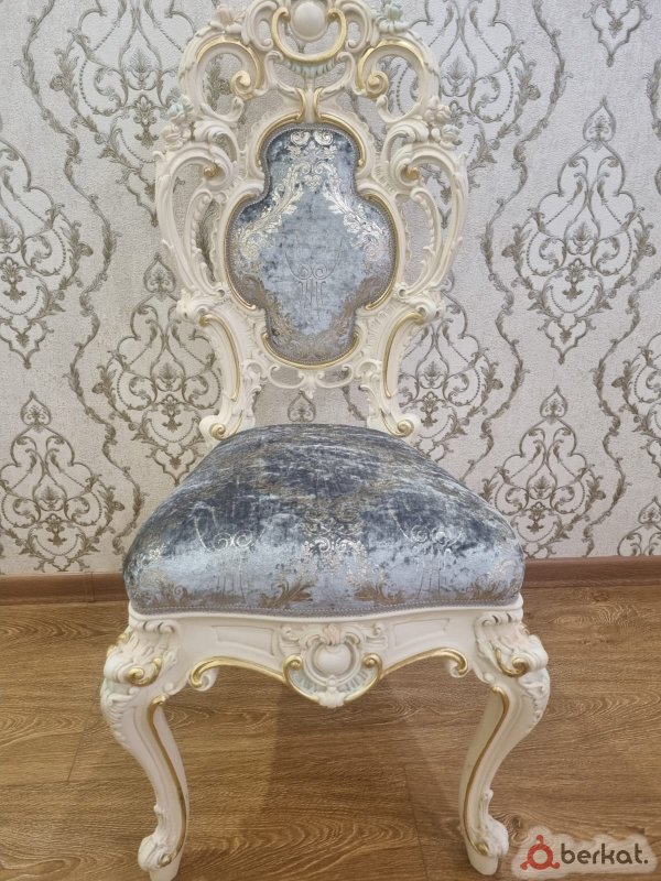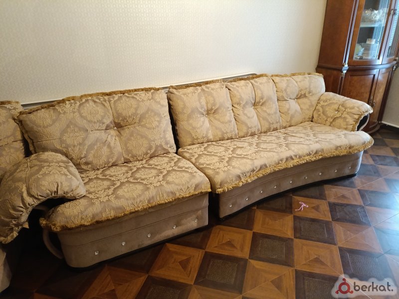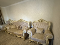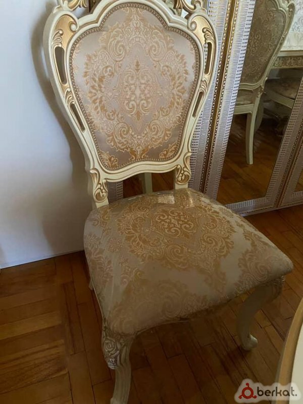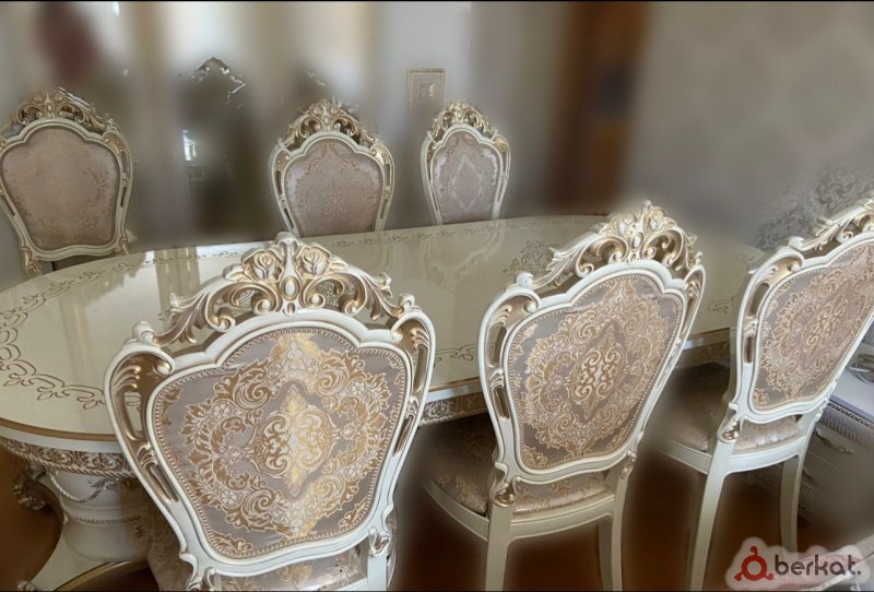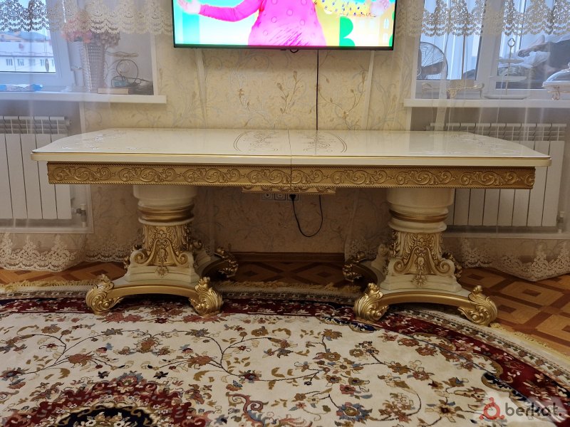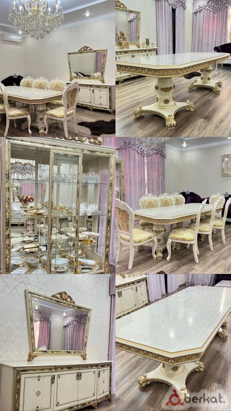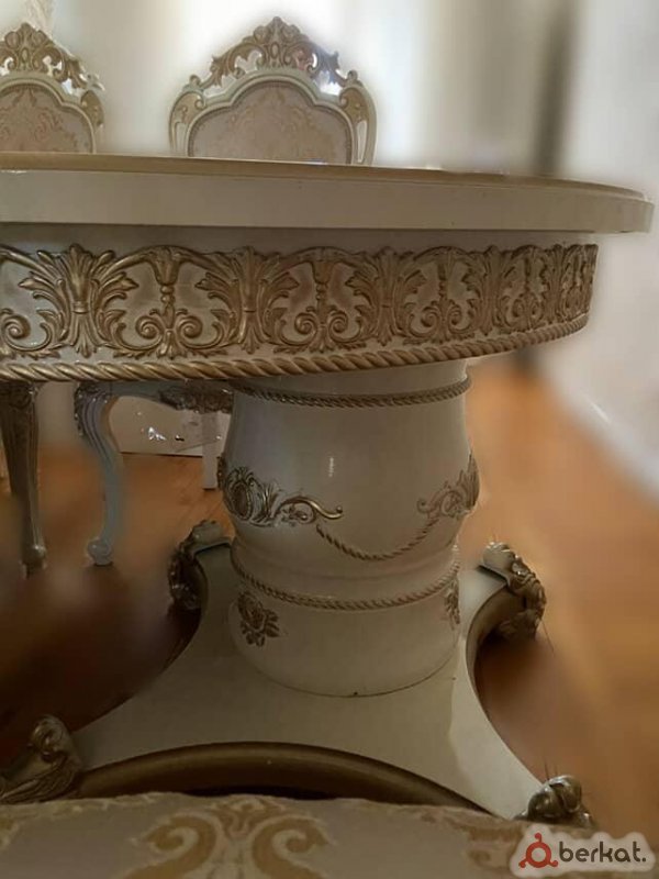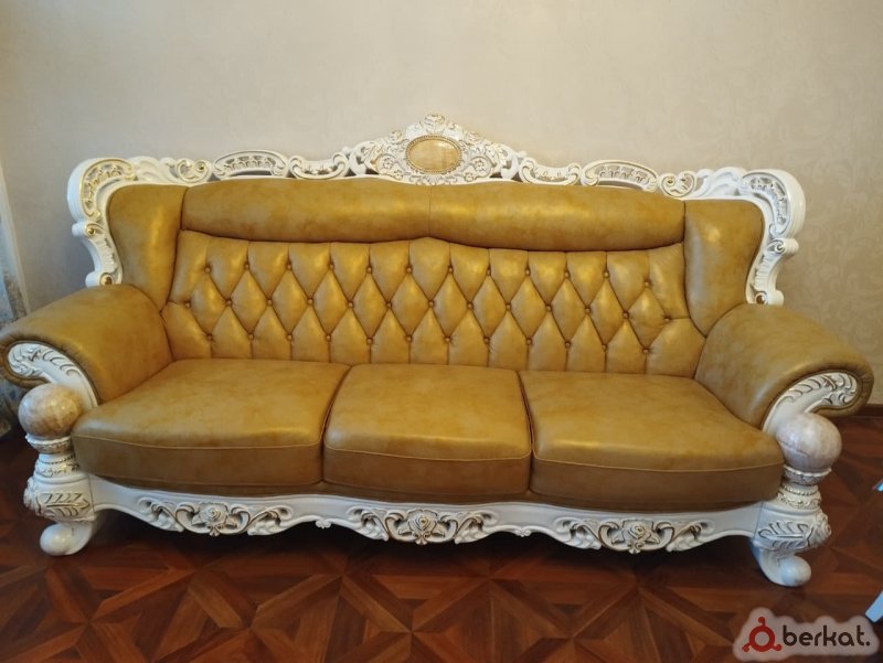 Продаю роскошный классический гарнитур для гостиной и столовой! Идеальный выбор для элегантного интерьера! Предлагаю в продажу полный комплект мебели в стиле барокко/рококо в идеальном состоянии. Это не просто мебель — это произведение искусства из премиум-материалов, которое подчеркнёт статус вашего дома. Использовался редко, без единой царапины, пятен или дефектов. Готов к немедленной установке!Что входит в комплект: Угловой диван-кресло (3-местный): Размер около 250x90 см, мягкая экокожа золотисто-бежевого цвета с кнопочной строчкой, белая резная деревянная рама с золотыми акцентами и резными ножками. Два стильных кресла: Аналогичная отделка, размер 90x90 см, идеальны для релакса