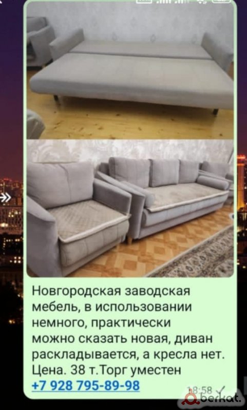 Продаётся новгородская качественная, мягкая мебель, в хорошем состоянии, почти не пользовались цена 35тыс, номер для связи 8928 795-89-98 Лейла.