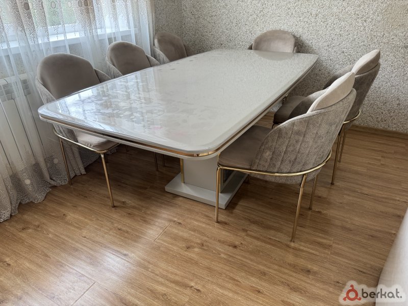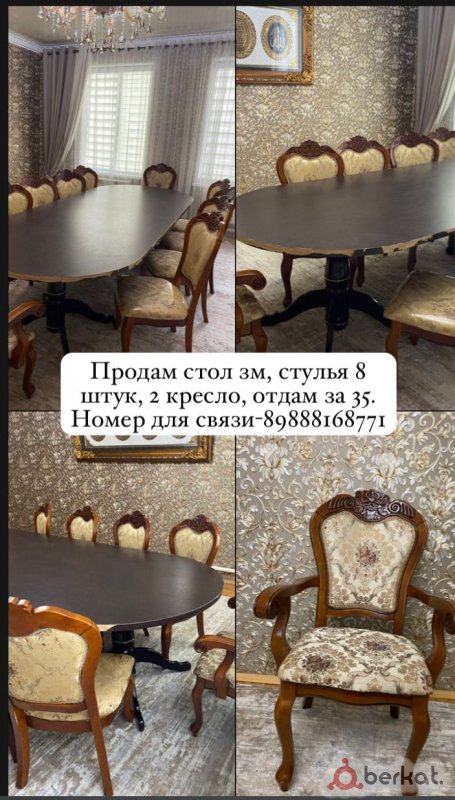 Ас, салам алейкум продам стол и 8 стульев новые, не кто не сидел как купили так и стоят в идеальном состоянии цена 70 тысяч окончательно отдам за 65 звонить писать 8988286993