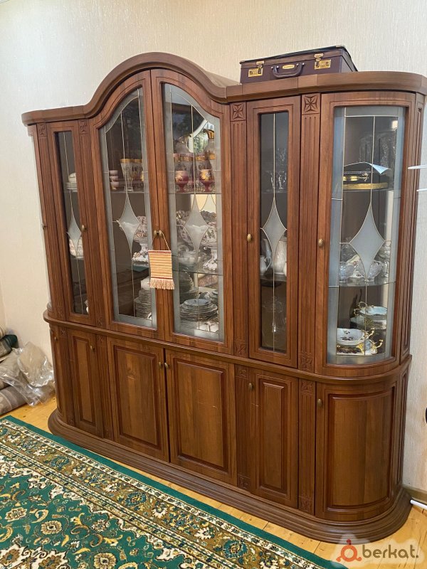 Из массива дерева (тёмный ореховый оттенок, возможно бук/орех), с арочным верхом, резьбой и золотистой фурнитурой. Витрина для посуды, шкафы и ящики — всё для удобства! Особенности: - Центральная витрина с большими стеклянными дверцами (полки внутри для посуды). - Боковые шкафы и нижние ящики для хранения. - Состояние хорошее, чистый, но есть небольшие минусы (царапины/потёртости — обсудим по телефону, чтобы вы знали всё заранее). Размеры: 250 см (длина) x 220 см (высота) x 50 см (глубина). Самовывоз. Цена: 25 000 руб., окончательная цена! Из с. Насыр-Корт. Звони: +7928-730-50-23!