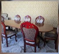 Продается очень прочный дубовый комплект в хорошем состоянии, включающий в себя овальный стол и восемь стульев. Комплект выполнен в классическом стиле. Стулья требуют незначительного ремонта и нужно будет немного укрепить. Размер стола - 2.42 на 1.10