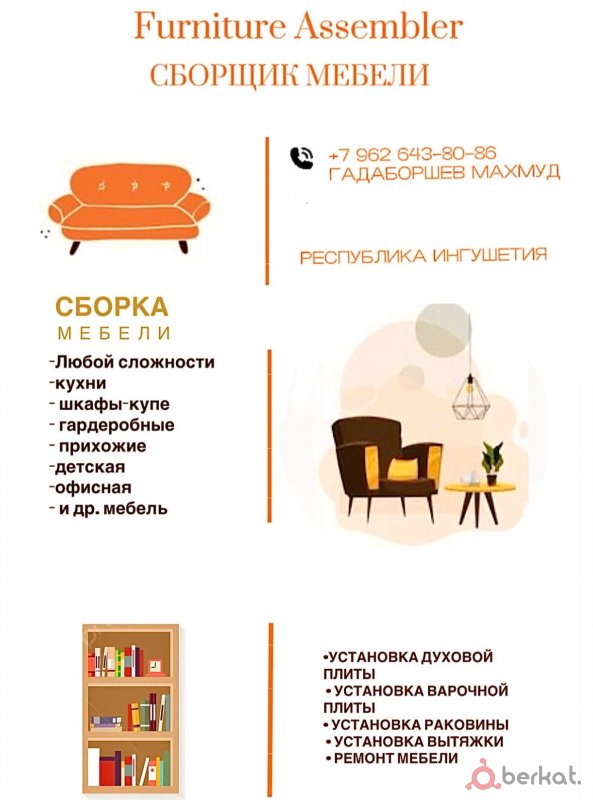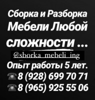 Профессиональная сборка,разборка и ремонт мебели всех видов и любой сложности. Таких как: ✔️Кухонная мебель ✔️спальная мебель ✔️гостиная мебель ✔️Детская мебель ✔️офисная мебель ✔️шкафы. Даем гарантию за проделанную работу. ☑️Опыт работы более 5 лет☑️ Установка бытовой техники таких как: ✔️раковина, ✔️варочная панель, ✔️вытяжка, ✔️духовой шкаф,✔️посудомоечная машина,✔️стиральная машина,✔️встраиваемый холодильник,✔️установка подцветки…☑️ Также в продаже имеется мебель ☑️дешевле чем в любом магазине Ингушетии По интересующимся вопросам Звоните или сообщение на ватсапп Тел.: 89344443436