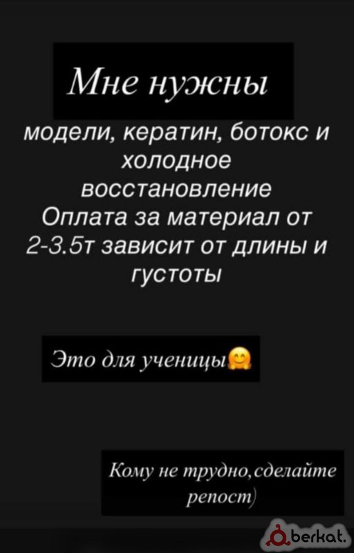 Мне нужны модели, кератин, ботокс и холодное восстановление Оплата за материал от 2-3.5т зависит от длины и густоты Это для ученицы Номер для связи +7 905 096 18 39