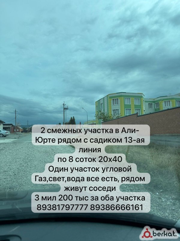 Продаются 2 смежных участка в Али-Юрте рядом с садиком 13-ая линия по 8 соток 20х40 Один участок угловой Газ, свет, вода все есть, рядом живут соседи Цена 3 мил 200 тыс за оба участка 89381797777