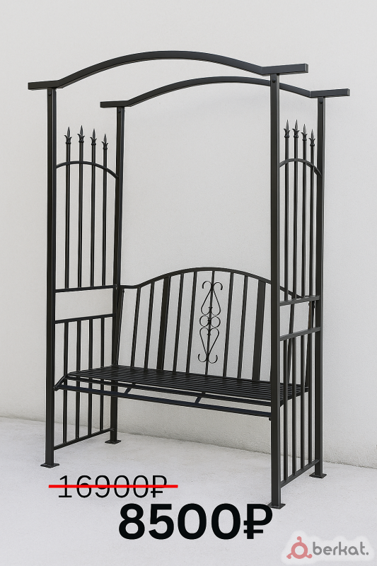 Садовая скамейка с аркой. Производство: Китай Высота: 200 см Длина: 120 см Ширина: 50см Материал: Металл хром Цвет: Чёрный-матовый Номер для связи 8938 434 34 04