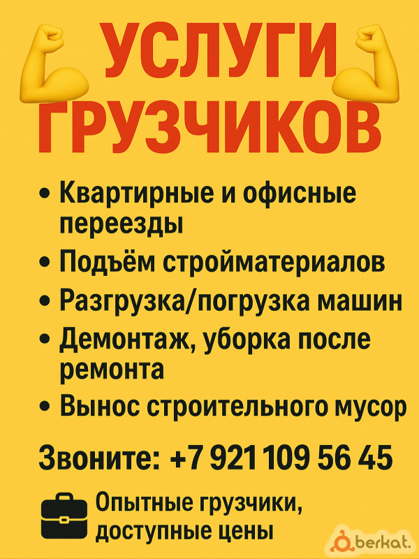 Услуги Грузчиков в Ингушетии Быстро, аккуратно, недорого! ✅ Переезды квартир и офисов ✅ Подъём стройматериалов ✅ Вынос мусора ✅ Погрузка/разгрузка фур и газелей Надёжные и опытные грузчики Есть газель при необходимости Работаем ежедневно, без выходных Звоните прямо сейчас: +7 (921) 109-56-45