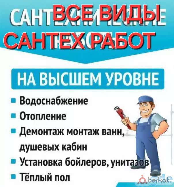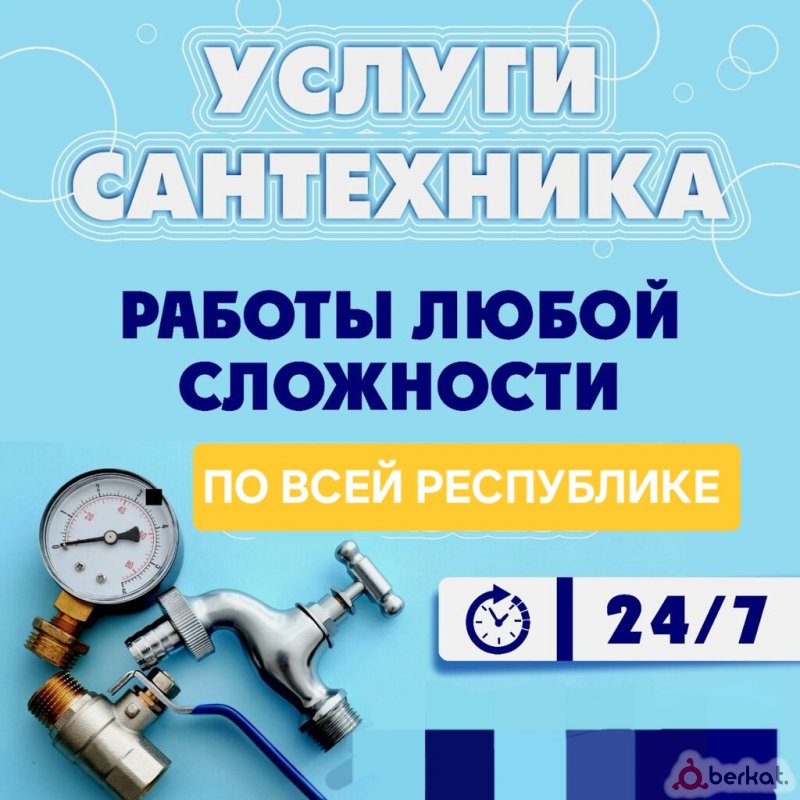 Услуги сантехника: Устранение засора, ремонт и установка смесителя , сифона ; установка ванны, раковина, унитаз! Водоснабжение, канализации всех видов . Установка стиральной машины , ремонт стиральной машины. установка боллера . Установка душевой кабины .установка и ремонт навесных котлов и газовые колонки .Качество гарантия .24/7 по республики.