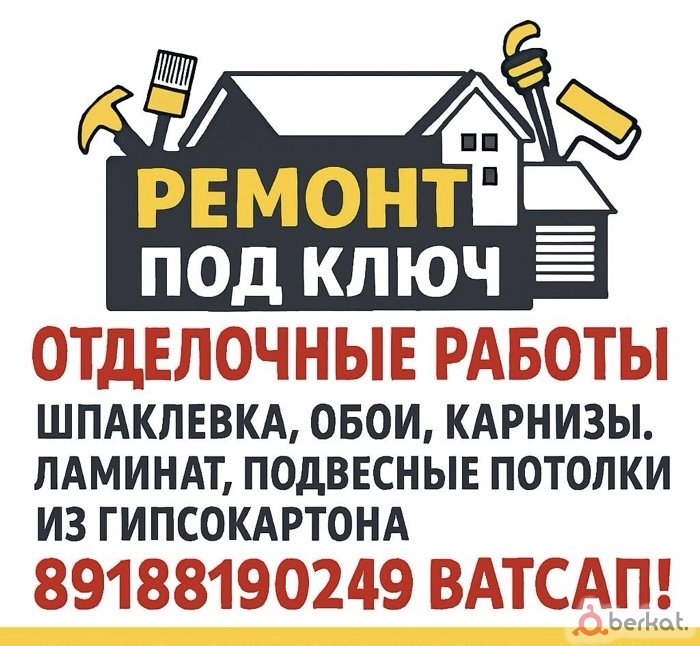 Выполняем отделочные работы, шпаклевка, поклей-ка обоев, установка карнизов, ламинат, подвесные потолки из гипсокартона. быстрый и качественный ремонт вашего дома!! 89188190249