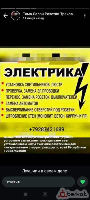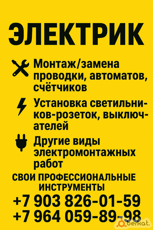 ⚡ Электрик — любые сложности! ⚡ ✅ Свои профессиональные инструменты ✅ Гарантия на выполненные работы ✅ Честные цены, без накруток ✅ Ответственный и аккуратный подход Что делаю: ✅ Замена и ремонт проводки (квартиры, дома, офисы) ✅ Установка розеток, выключателей, светильников ✅ Быстро найду и устраню любые неполадки (нет света, выбивает автомат, греется проводка) ✅ Сборка и подключение электрощитов «под ключ»