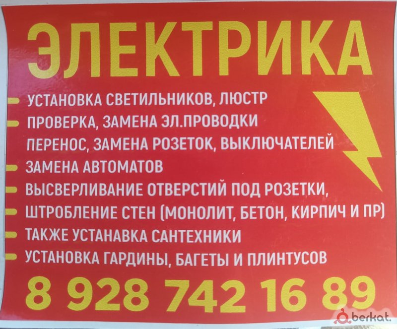 Выполняю все виды электромонтажных работ, устранение неисправностей проводки и замыканий, монтаж и демонтаж проводки, установка уличных фонарей, протягивание 380 или 220 вольт, установка щитка и розеток, люстров, укладка тёплого пола и подключение, и многое другое, качественно и быстро Телефон: +7(928)097-94-94