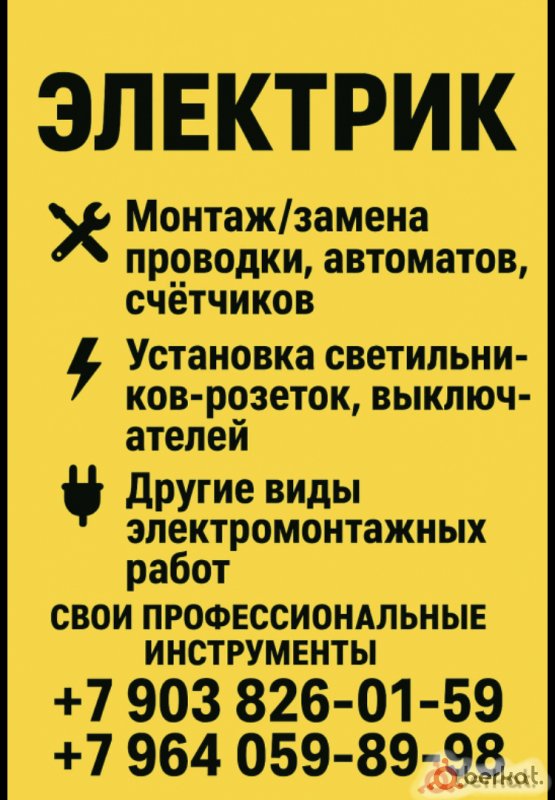 Электрик — любые сложности! ⚡ ✅ Свои профессиональные инструменты ✅ Гарантия на выполненные работы ✅ Честные цены, без накруток ✅ Ответственный и аккуратный подход Что делаю: ✅ Замена и ремонт проводки (квартиры, дома, офисы) ✅ Установка розеток, выключателей, светильников ✅ Быстро найду и устраню любые неполадки (нет света, выбивает автомат, греется проводка) ✅ Сборка и подключение электрощитов «под ключ