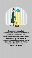 Услуги сборки и установки люстры, вывесок любой сложности. Также устанавливаем розетки, выключатели, плафоны, бра, варочные панели, мойки, гардины, вешалки и т.д. Также делаем ремонт вывесок, люстр. Работаем быстро, качественно и с гарантией. Цены за услугу зависит от объема и сложности монтажа. Работаю по всей Ингушетии 24/7 . Более 200 довольных клиентов. С нами легко договориться