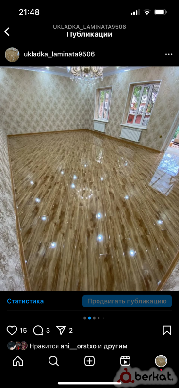 Ассаламу алайкум Наши работы можно посмотреть в инстаграмме:ukladka_laminata9506 Отвечаем за качество и правильности укладки. Также можем подобрать ламинат плинтуса