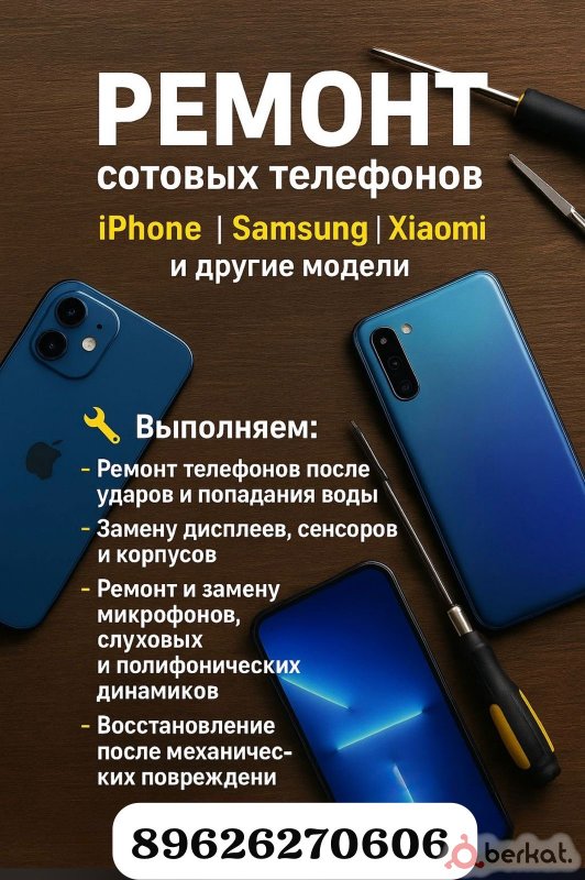 Ассаламу алейкум варахьматуллоах1,Ремонт сотовых Iphone, samsung, xiaomi и любой модели телефона. *Ремонт телефона после удара *Ремонт телефона после воды *Замена дисплеев, слуховых и полифонических динамиков, микрофонов, сенсоров, панелей и т.п. *Прошивка сотовых телефонов, разблокировка *Профессиональная диагностика вац ап 89881255475
