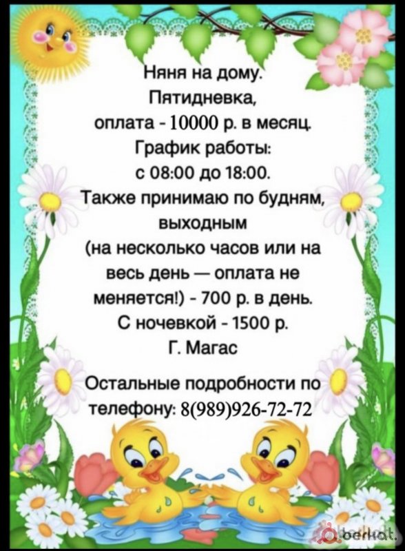 Няня на дому. Пятидневка, оплата - 10000 р. в месяц График работы: с 08:00 до 18:00. Также принимаю по будням, выходным (на несколько часов или на весь день — оплата не меняется!) - 700 р. в день. С ночевкой - 1500 р. Г. Магас. Остальные подробности по телефону: 8(989)926-72-72