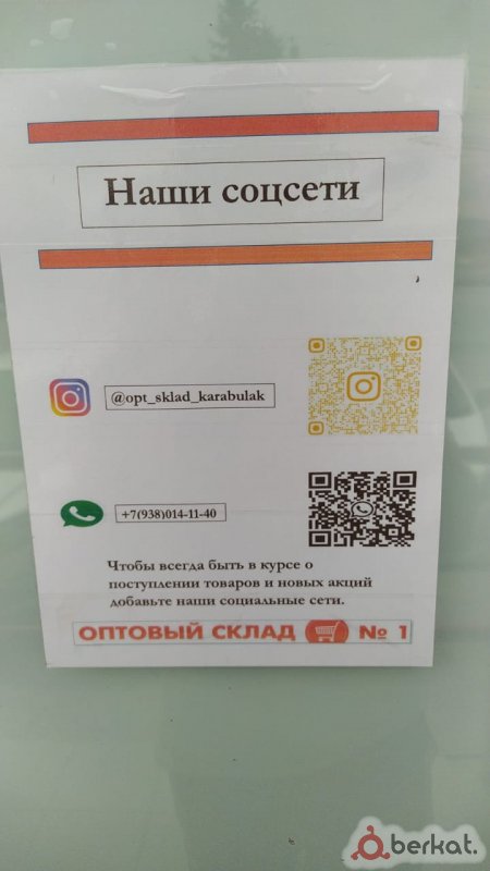 Оптовый склад рад видеть вас у себя у нас вы найдете широкий ассортимент товаров повседневнего спроса продукты,бытовая химия,игрушки канцелярия посуда и многое другое,напитки натуральные соки в широком ассортименте мука сахар подсолнечное масло ,сливочное масло,куры яйцо рыба ,выпечка ,колбасные изделия , крупы , множество производителей а также местных,молочная местная домашняя продукция тоже бывает постоянно в наличии ,цены оптовые ,вся продукция всегда максимальной свежести,фрукты овощи тоже постоянно в наличии,наш адрес г Карабулак ул джабагиева 163,через дорогу от говд