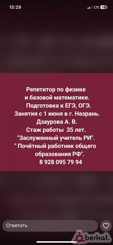 Предлагаю услуги репетитора начальных классов. ( 1-4 класс) Математика. Русский язык . Чтение. Помогу устранить пробелы в учёбе. Подтяну по отстающим предметам. Окажу помощь в выполнении домашних заданий. Подготовлю к впр. Стаж работы в школе 15 лет. Подробнее по телефону: ?89287308810 Наш адрес: г. Назрань ТЦ Маяк 3 этаж . учебный центр " Облако знаний "