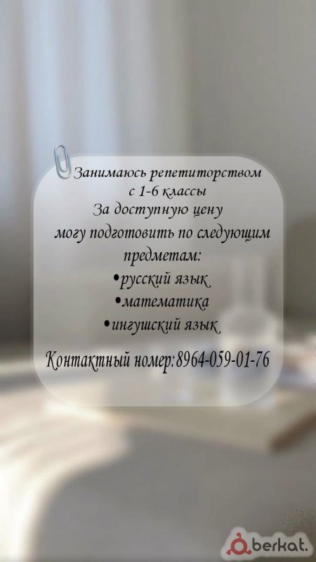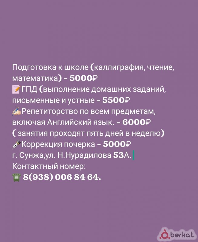 Подготовка к школе (каллиграфия, чтение, математика) - 5000₽ ?ГПД (выполнение домашних заданий, письменные и устные - 5500₽ ✍?Репетиторство по всем предметам, включая Английский язык. - 6000₽( занятия проходят пять дней в неделю) ✒️Коррекция почерка - 5000₽ г. Сунжа,ул. Н.Нурадилова 53А. Контактный номер: ☎ 8(938) 006 84 64.