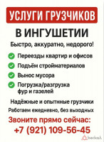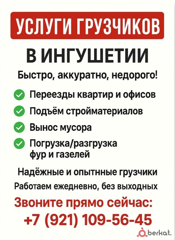 Услуги Грузчиков в Ингушетии Быстро, аккуратно, недорого! ✅ Переезды квартир и офисов ✅ Подъём стройматериалов ✅ Вынос мусора ✅ Погрузка/разгрузка фур и газелей Надёжные и опытные грузчики Есть газель при необходимости Работаем ежедневно, без выходных Звоните/пишите прямо сейчас: +7 (921) 109-56-45